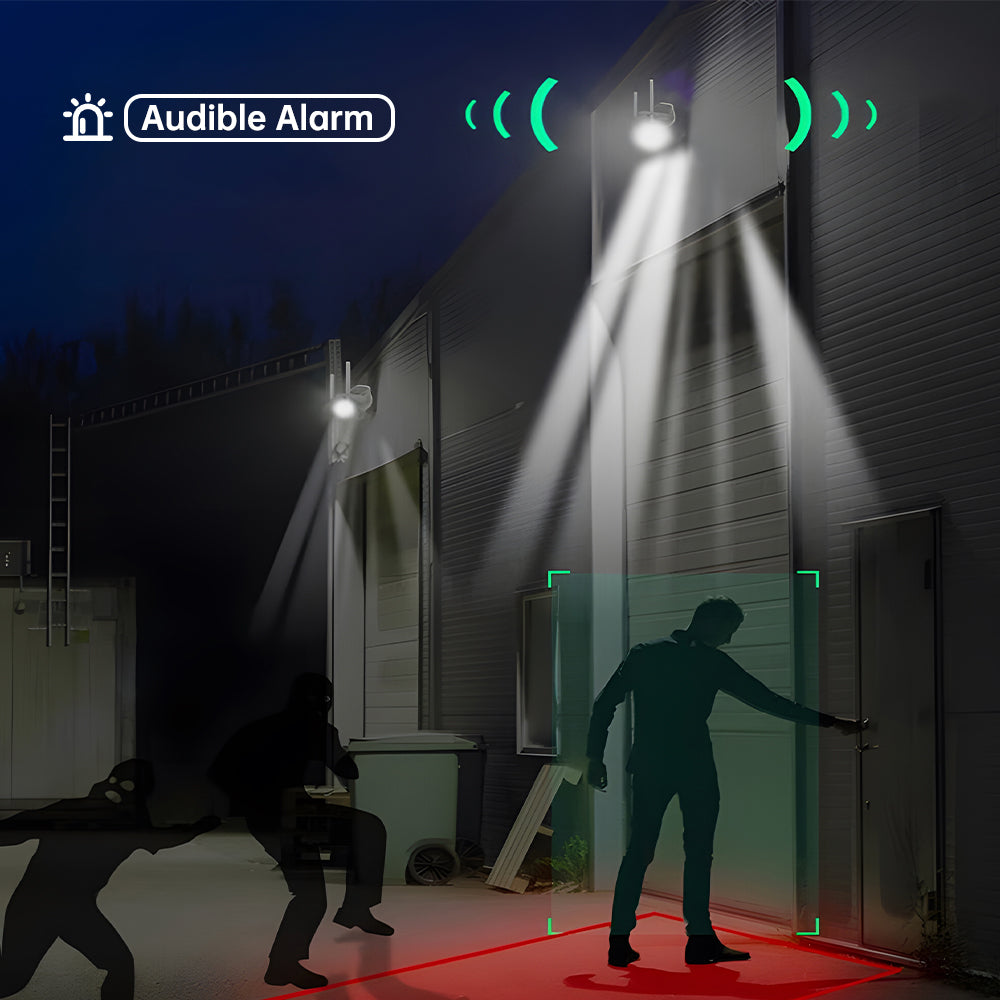 This security camera will be activated when the moment motion is detected. It then automatically turns on the mini flood light, alarms the security siren, records the scene and sends alerts to your smartphone.